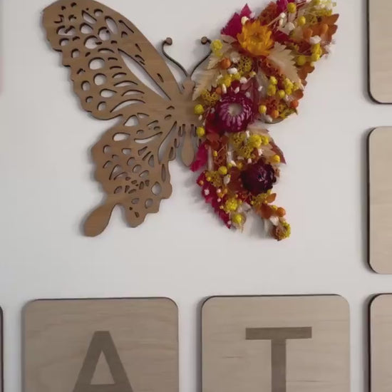 One wing features a sculpted design, revealing light and airy motifs. The other wing is adorned with a selection of timelessly charming dried flowers, meticulously glued to create a vibrant floral display. The warm, golden hues of the flowers evoke the softness of nature, creating a poetic atmosphere in your home.